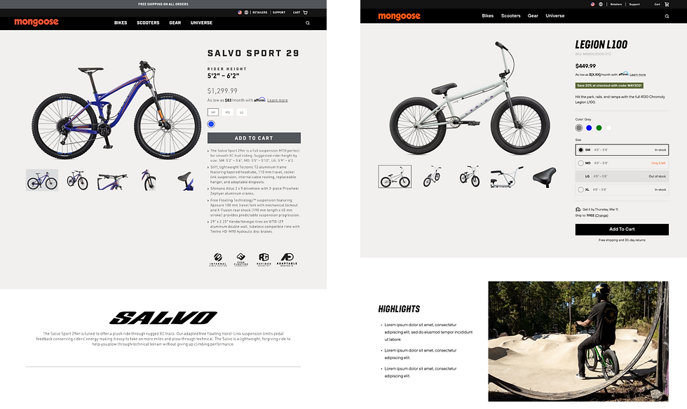 The Mongoose product page lacked a certain degree of cohesion with the radical, action-oriented bikes they’re known for. Undiscoverable product information, jargon-heavy features, and a lack of lifestyle content mired the experience, making users sift through dull and confusing information to find a suitable product.